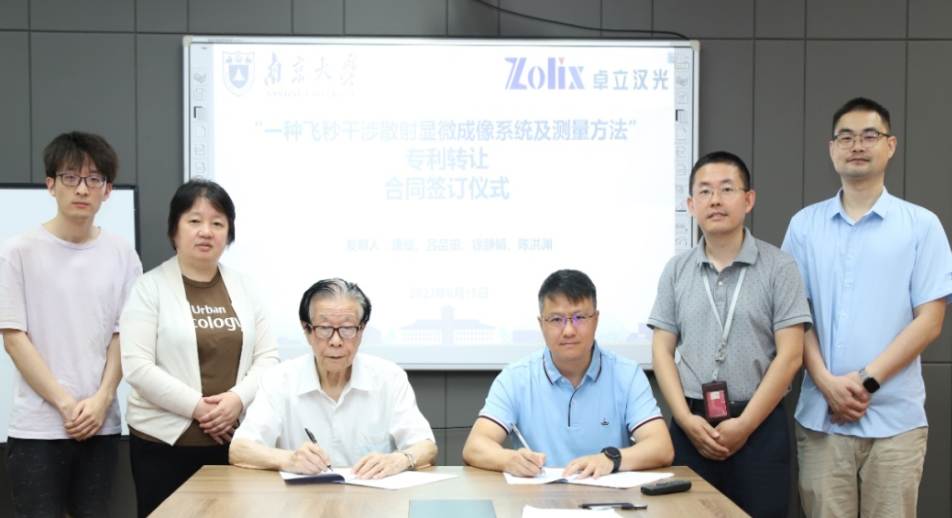 近日,卓立汉光集团董磊副总经理带领研发团队拜访南京大学陈洪渊院士团队,在南京大学仙林校区化学楼隆重举行了“一种飞秒干涉散射显微成像系统及测量方法”专利转让的签约仪式。