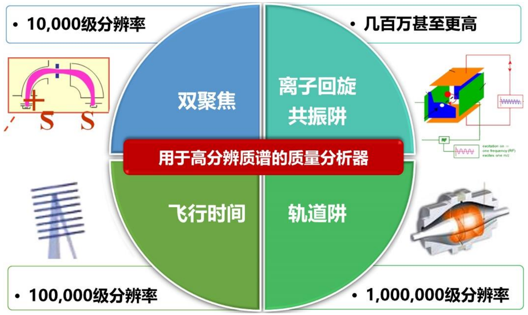 业内通常把分辨率在10000(FWHM)以上的质谱称为高分辨质谱,主要包括双聚焦磁质谱、飞行时间质谱、轨道阱质谱及傅里叶变换离子回旋共振质谱。