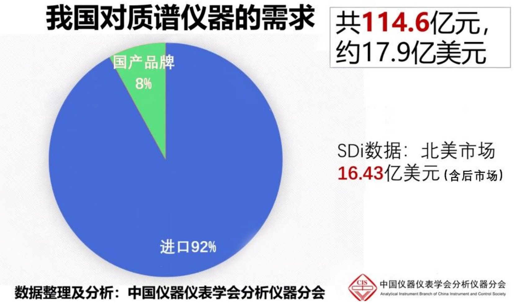 我国是全球最大的质谱市场,却也是国产占比最低的分析仪器市场。2020年我国进口质谱仪器13889台/套,销售总额约105亿元,占比92%,国产质谱销售额仅占8%。