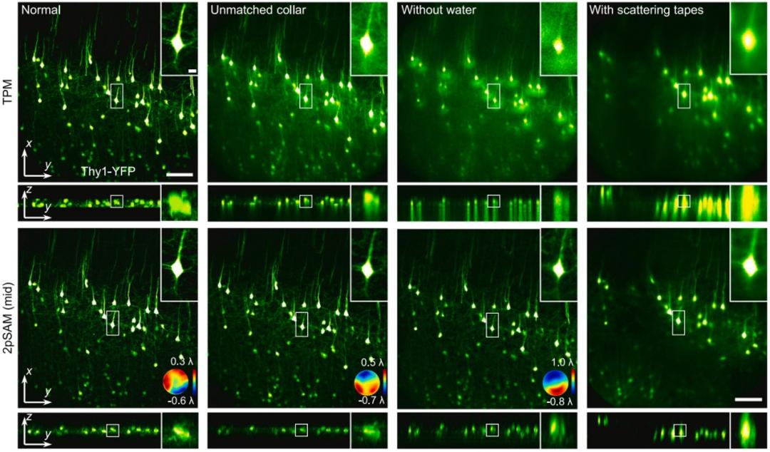 图2. 双光子合成孔径显微术(2pSAM)结合数字自适应光学(DAO)与传统双光子显微镜(TPM)面对复杂成像条件下的结果对比。从左至右依次为:正常条件下拍摄,物镜校正环不匹配情况下拍摄,物镜为水镜且缺乏浸润水的情况下拍摄,物镜与样本之间增加散射胶带后进行拍摄