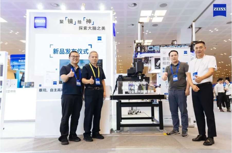▲全国神经年会上,复旦团队与蔡司合作发布deepvision多光子成像与全息光刺激系统,李博(左一)、董必勤(右二)与复旦脑科学转化研究院院长、中国科学院院士段树民(左二)和蔡司中国区副总裁张育薪博士(右一)共同为产品揭幕