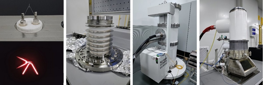 图左一 电子源针尖与高温比色 图左二 电子加速陶瓷管 图右一 200kV热发射电子枪 图右二 超高稳定度高压电源