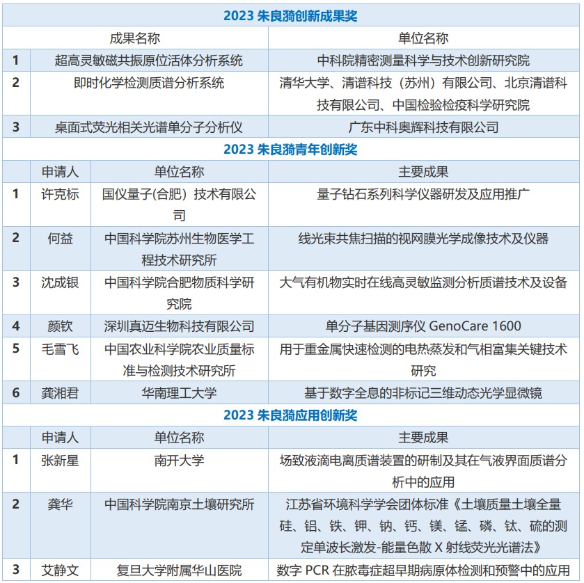 经过最终评选,荣获2023年“朱良漪分析仪器创新奖”之“创新成果奖“共有3项、”青年创新奖“获奖人共有6名、”应用创新奖“获奖人共3名。获奖名单如下: