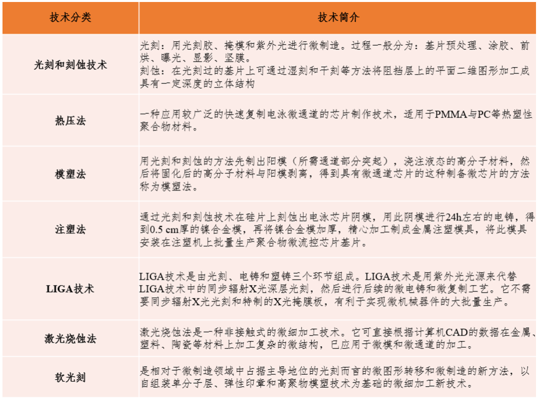 (二)微流控芯片制造技术:众多,大致分为以下几种: