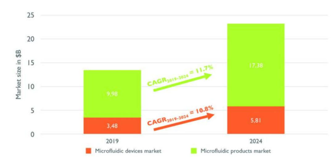 根据Yole分析师最新数据统计显示,2018年全球微流控产品市场规模达到87亿美元,2019至2024年期间的复合年增长率高达11.7%,预计2024年将达到174亿美元。两项主要应用为:(1)即时检测(POCT);(2)制药/生命科学研究(包括测序、基因组学和蛋白质组学)。此外其它微流控应用也在不断发展。