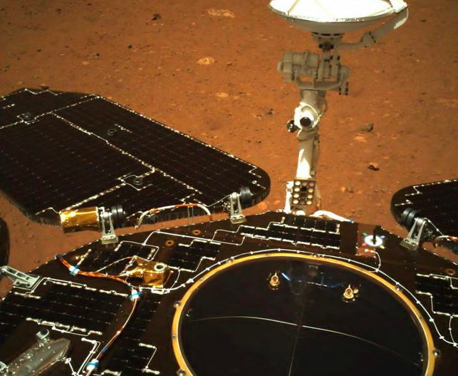 图二可看到火星车太阳翼、天线均正常展开,太阳翼板很干净,未见有火星灰覆盖。