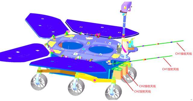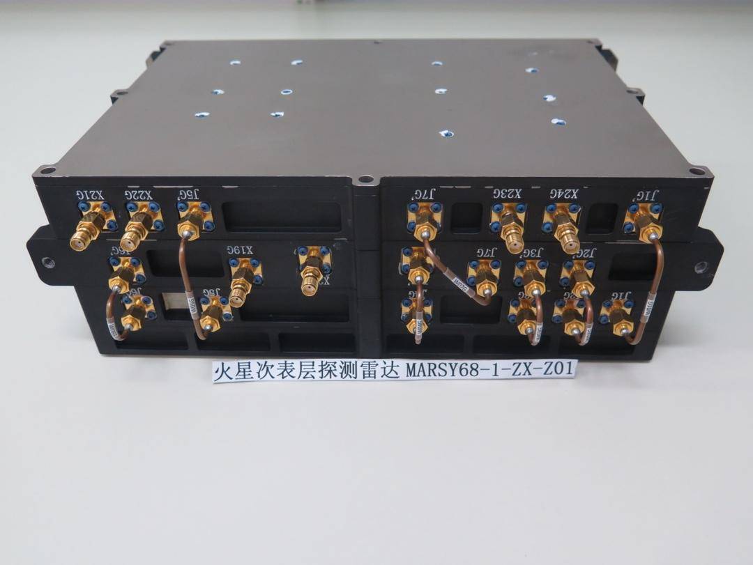 火星车次表层探测雷达是一种基于火星车平台的高分辨率火星次表层地质结构探测雷达,是实现火星探测工程科学探测任务的重要载荷之一。它由雷达电子学单元、低频通道发射天线、低频通道接收天线、高频通道发射天线、高频通道接收天线、电缆组件六部分组成。该雷达包含低频通道和高频通道两个通道。低频通道用于巡视区深层的火星次表层结构探测;高频通道用于巡视区浅层火星表面土壤、冰层结构的高分辨率全极化探测。