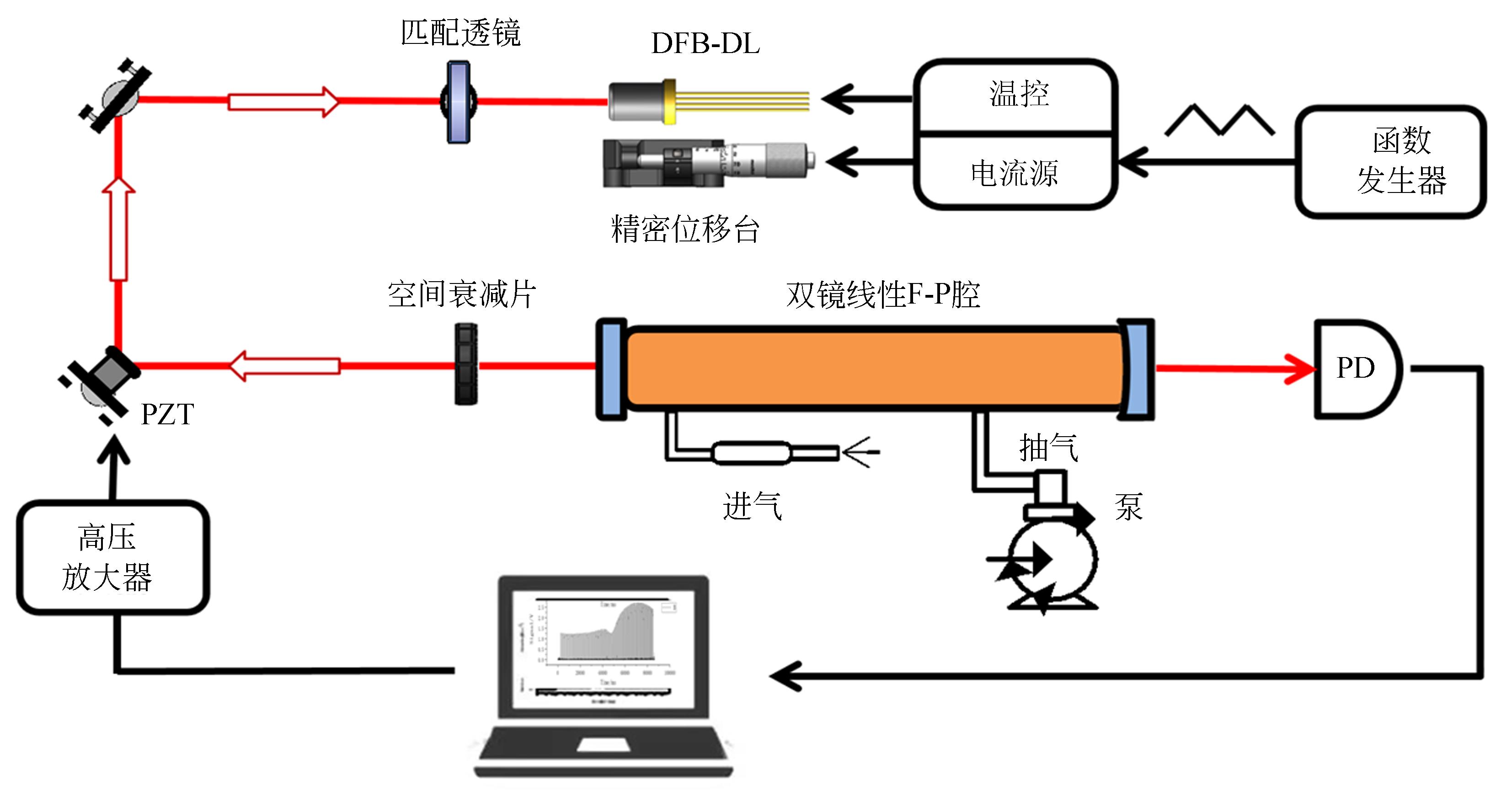 为了解决上述问题,人们发展了光学反馈腔增强吸收光谱(OF-CEAS)技术,传统的OF-CEAS大都采用V型腔结构,山西大学马维光教授课题组则选择使用分布反馈式半导体激光器(DFB-DL)作为光源,提出了一种基于双镜法布里-玻罗腔的光学反馈腔增强吸收光谱技术,并于近期发表在《光学精密工程》期刊,成为其封面文章“近红外光学反馈线性腔增强吸收光谱技术”。