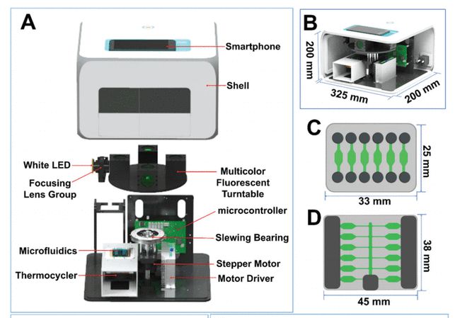 聚合酶链式反应芯片中包含 6 个腔室,每个腔室都能进行独立的聚合酶链式反应。而等温的重组酶聚合酶扩增(RPA)芯片包含 12 个小腔室,使用薄膜对其密封后,就能确保反应密封进行。当把扩增试剂载入微流控芯片,并放置在 MS² 设备上时,智能手机即可控制整个下游扩增和分析,包括温度设置、光通道模式选择、图像采集和数据处理。