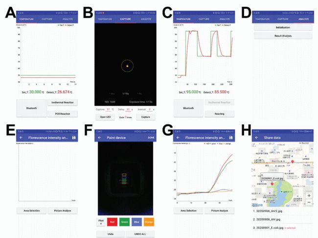 具体来说,App 控制着整个使用过程,将 App 的温度接口连接到微控制器上的蓝牙,并设置聚合酶链式反应模式或等温模式,此外还能显示实时温度数据。在一个名为 CAPTURE 界面中,用户可以设置荧光图像采集模式,包括重组酶聚合酶扩增的手动图像采集模式、定量聚合酶链式反应的自动图像采集模式、以及多路聚合酶链式反应的自动图像采集模式。