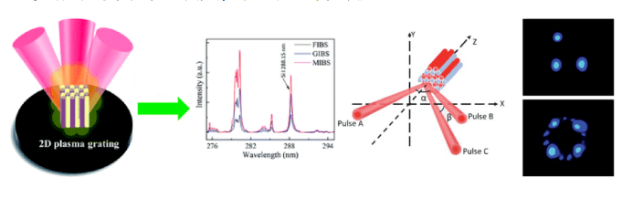 为了进一步提高对样品的激发效果,延长激发产生的等离子体寿命,增强光谱信号,团队提出基于等离子体光栅的多脉冲耦合激发诱导击穿光谱MIBS新技术。