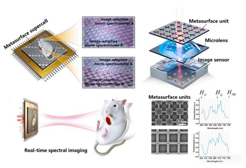 本工作研制成功了国际首款实时超光谱成像芯片:提出基于图像自适应的可重构超表面超晶胞,通过超表面单元结构的空分复用,解决了计算光谱难以兼顾频谱分辨率和空间分辨率的局限;在实验上成功制备出的国际首款实时超光谱成像芯片,将单点光谱仪的尺寸缩小到百微米以下,空间分辨率超过15万像素,即在0.5 cm2芯片上集成了15万个微型光谱仪,可快速获得每个像素点的光谱,工作谱宽450-750nm,分辨率高达0.8nm;使用实时超光谱成像芯片首次测量了活体大鼠脑部血红蛋白及其衍生物的特征光谱的动态变化,时间分辨率可达30Hz,可进一步利用神经血氧耦合的机制得出脑部神经元的活跃状态。