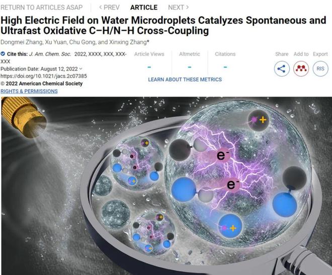 在本工作中,仅仅使用底物,不需要过渡金属催化剂、强氧化剂、高温、有机溶剂、光和电化学电池等条件,在水喷雾生成的微液滴中,就实现了氧化C-H/N-H偶联。近年来,水微液滴化学成为一个令人兴奋的领域,因为许多原本在水溶液中难以进行的化学反应,通过微液滴可以自发发生,甚至可以被加速到原来的一百万倍。该方法已成功地用于加速许多不同的有机反应。微液滴的一系列独特性质,如极端pH条件、部分溶剂化、试剂的富集和排列、超高电场等被认为是反应加速的原因,其中最有趣的性质是在微液滴表面自发形成的超高电场(~109V/m)。该电场甚至可以撕裂水中的OH -,在微液滴中产生电子和•OH, 由此产生的电子和•OH可以进一步引发还原和氧化反应,这看似完全矛盾的两个性质居然同时存在,使得微液滴成为了“神奇的矛盾统一体”。