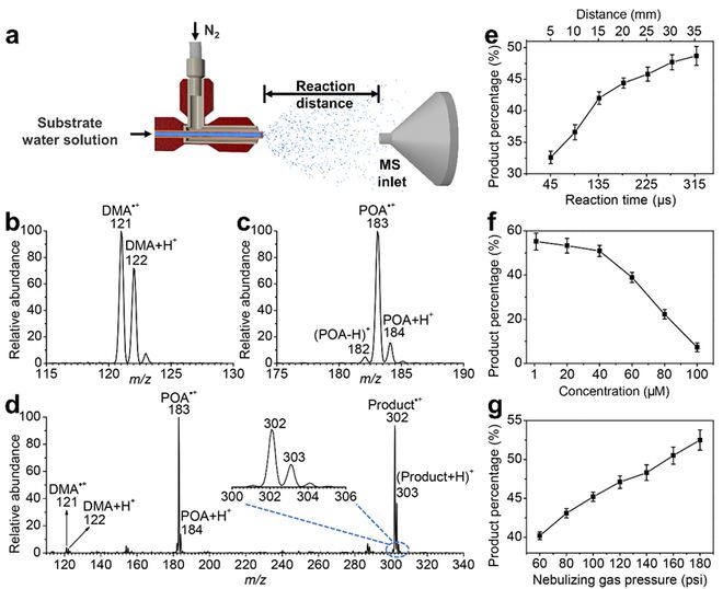 图1. 水微液滴中DMA和POA自发进行的C-N偶联反应的质谱分析