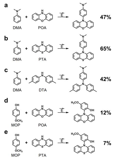 此外,本工作还研究了其他四种氧化C-H/N-H偶联体系。这些反应主要发生在DMA与吩噻嗪(PTA)、DMA与4,4'-二甲基二苯胺(DTA)、4-甲氧基苯酚(MOP)与POA、MOP与PTA之间。研究结果表明,这五种不同的反应在微液滴中都是自发的,并且都是超快的。