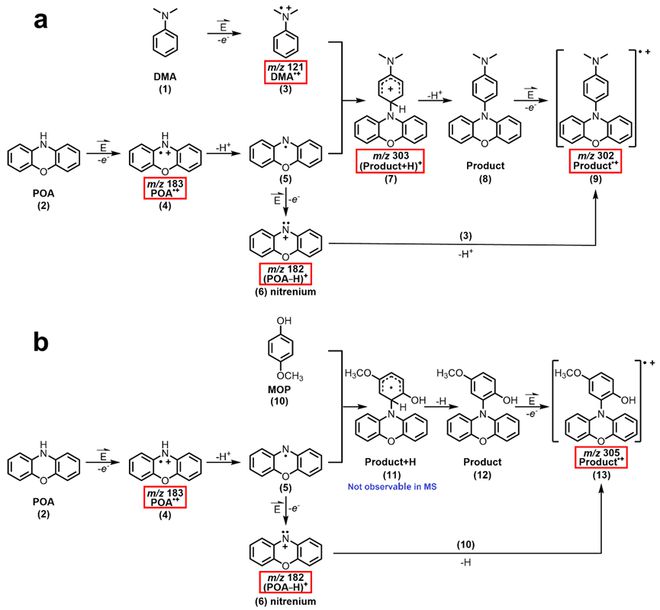 图3 . (a) DMA与POA之间自发的自由基/自由基偶联反应;(b) MOP与POA之间自发的分子/自由基偶联反应。红框表示的物种是在质谱中观察到的。