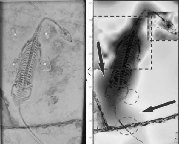 其中,左边为待测样品贵州龙化石,右边为Ca元素含量分布图,元素含量越高,则在图中显示的颜色越深。