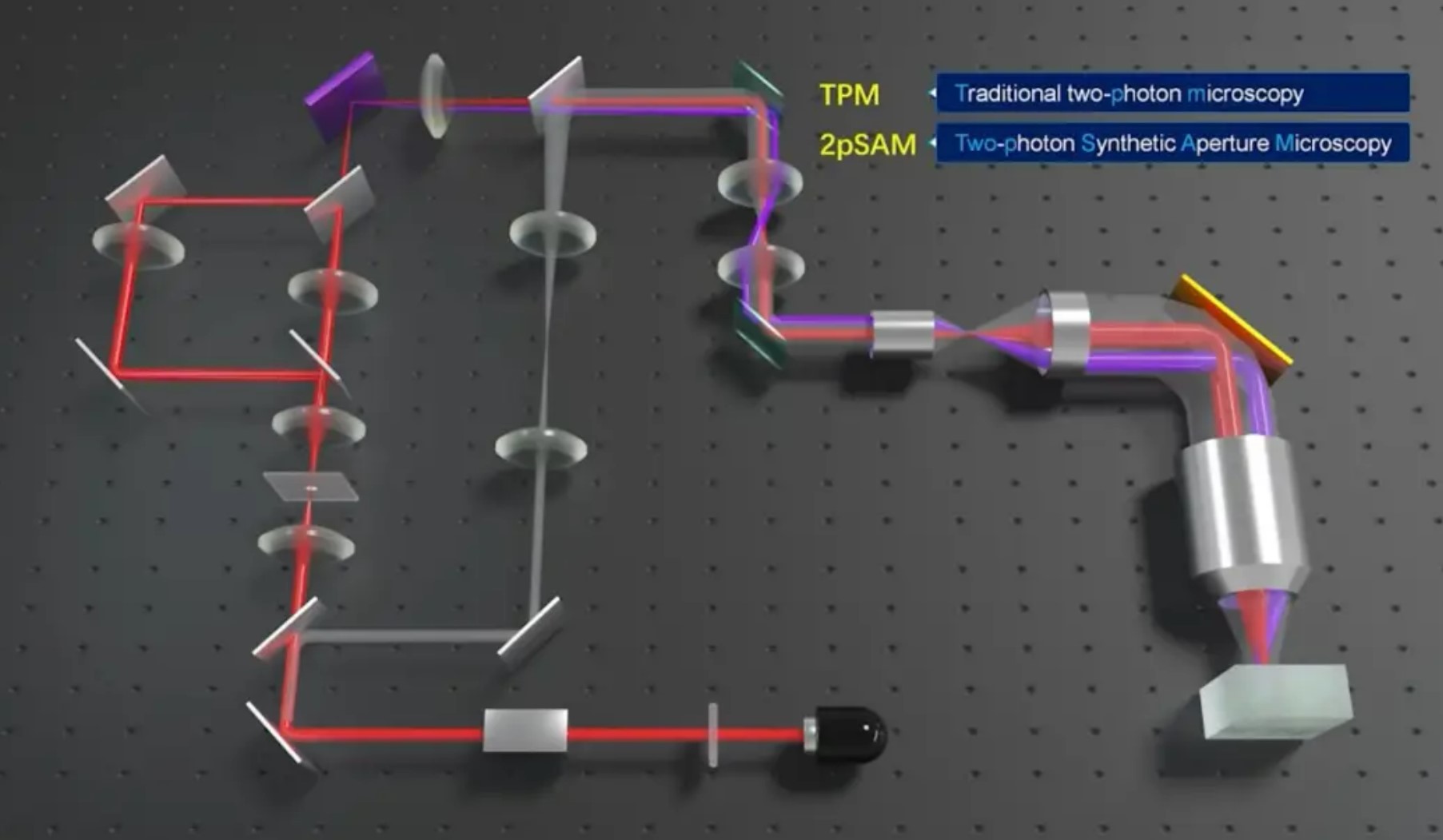 2023年5月,清华大学戴琼海院士团队在Cell期刊发表最新研究论文,首次提出了基于空间约束的多角度衍射编码,实现非相干光孔径合成;建立了双光子合成孔径显微术(2pSAM),可以实现深层组织毫秒级的亚细胞三维成像,显著降低光毒性(相当于比TPM慢1000倍以上)。2pSAM能够在哺乳动物深层散射组织中非侵入式观测大范围亚细胞级动态变化,将毫秒级三维连续观测时长从数分钟提高到数十小时,为系统性地研究大规模细胞在不同生理与病理状态下的交互作用打开了大门。