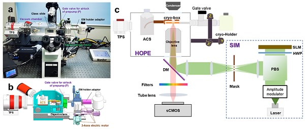 2023年5月,中国科学院生物物理研究所研究团队在前期研发的冷冻光电关联成像高真空光学冷台HOPE基础上,通过引入结构光照明成像技术,成功研制了冷冻结构光照明成像系统HOPE-SIM,实现了横向优于200纳米的光学分辨率,以及优于150纳米的光镜-聚焦离子束三维关联对齐精度。HOPE-SIM通过冷冻样品杆直接衔接三束共焦光电关联成像系统ELI-TriScope,在实现高分辨三维冷冻荧光成像的同时,可以完成后续原位荧光实时监控聚焦离子束减薄全技术流程,在原位结构生物学中有巨大应用潜力。