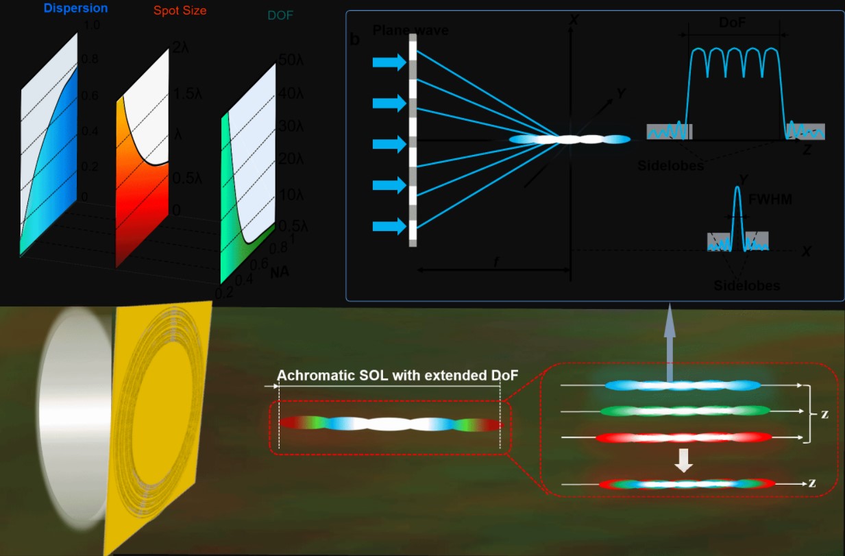 2023年5月,中国科学院西安光学精密机械研究所瞬态光学与光子技术国家重点实验室在太赫兹频段可变焦消色差超透镜领域取得新进展。研究团队采用几何相位和传输相位相结合的方式,巧妙设计超透镜单元结构的排布方式与空间取向,采用单层超透镜实现了太赫兹波的宽频带聚焦,有效消除了色差现象。该成果为设计多功能消色差超透镜提供了新思路,有望进一步拓展太赫兹频段超透镜在显微成像和内窥镜等领域的实际应用。