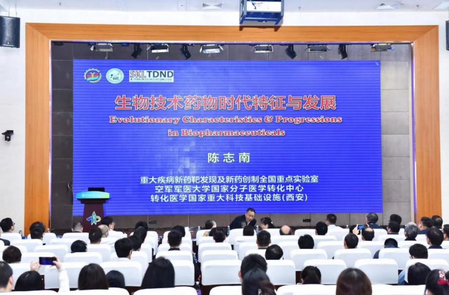 在主题报告环节,空军军医大学陈志南院士进行了《生物技术药物时代特征与进展》的线上主题报告。陈志南院士对生物技术药物的现状、时代特征以及未来发展方向三方面进行了详细的论述,并向分享了大团队在生物技术药物研究的工作进展。他指出,我国国内抗体药物虽起步晚,但是发展迅速,国内市场对抗体药物需求巨大。针对生物技术药物的发展现状和时代特征,提出了原创新药靶标发现及基础研究、“AI+知识”新成药模式、合成生物学、生物药物智能制造等9个生物技术药物的发展方向。