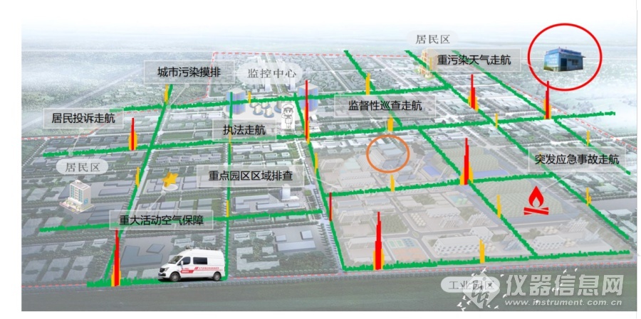 双通道分析模式适用于VOCs快速准确定性定量,仪器通过现场对污染物的快速分析,准确得出污染物定性和定量结果,建立城市VOCs污染地图(图2),识别风险区域和重点管控企业,为VOCs污染溯源和精准防控提供实时有效的监测数据。